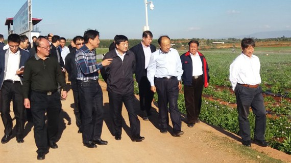 11月5日下昼,,,,,安徽省副省长方春明、水利厅厅长方志宏、省农委主任孙正东等一行十人莅临陆良县恨虎坝中型灌区立异机制试点项目区举行调研考察。。。。。。。。云南省水利厅党委书记刘刚、副厅长胡朝碧、资财处长曾毅、曲靖市常务副市长傅学宾等陪同调研。。。。。。。。新宝gg节水集团总裁谢永生、财务总监李福武、云南公司董事长贾林及安徽、江苏片区有关认真人等加入调研。。。。。。。。