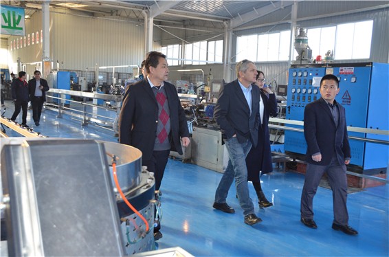 新宝gg节水(天津)有限公司总司理张学双、常务副总司理潘钰、新宝gg研究院副院长战国隆陪同Tzur Harel先生在滴灌(管)带生产车间旅行考察